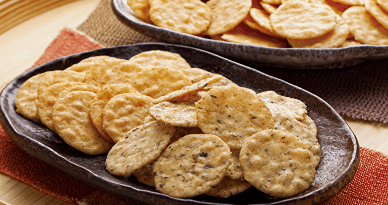 100%国産米を使用したおせんべい。えび、コーン、ソース、カレーの4種類でお楽しみいただけます。