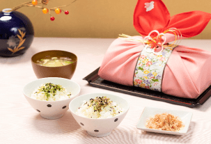 結婚式では、それぞれの縁起物に意味が込められています。 たとえば、かつお節には「夫婦円満」、昆布には「子孫繁栄」、 梅干しには「長寿祈願」など。