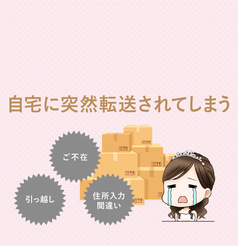 ゲスト様の「長期ご不在」「お引越し」、ご注文時の「住所入力間違え」などの理由で保管期限が過ぎると配送会社から自動的に新郎新婦様宅に転送になってしまう場合があります。