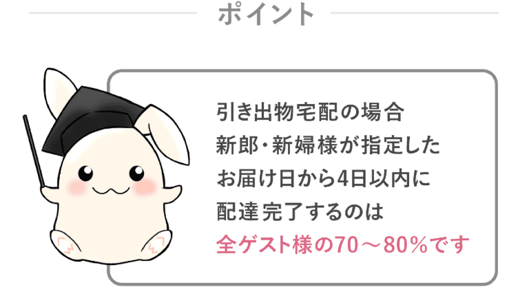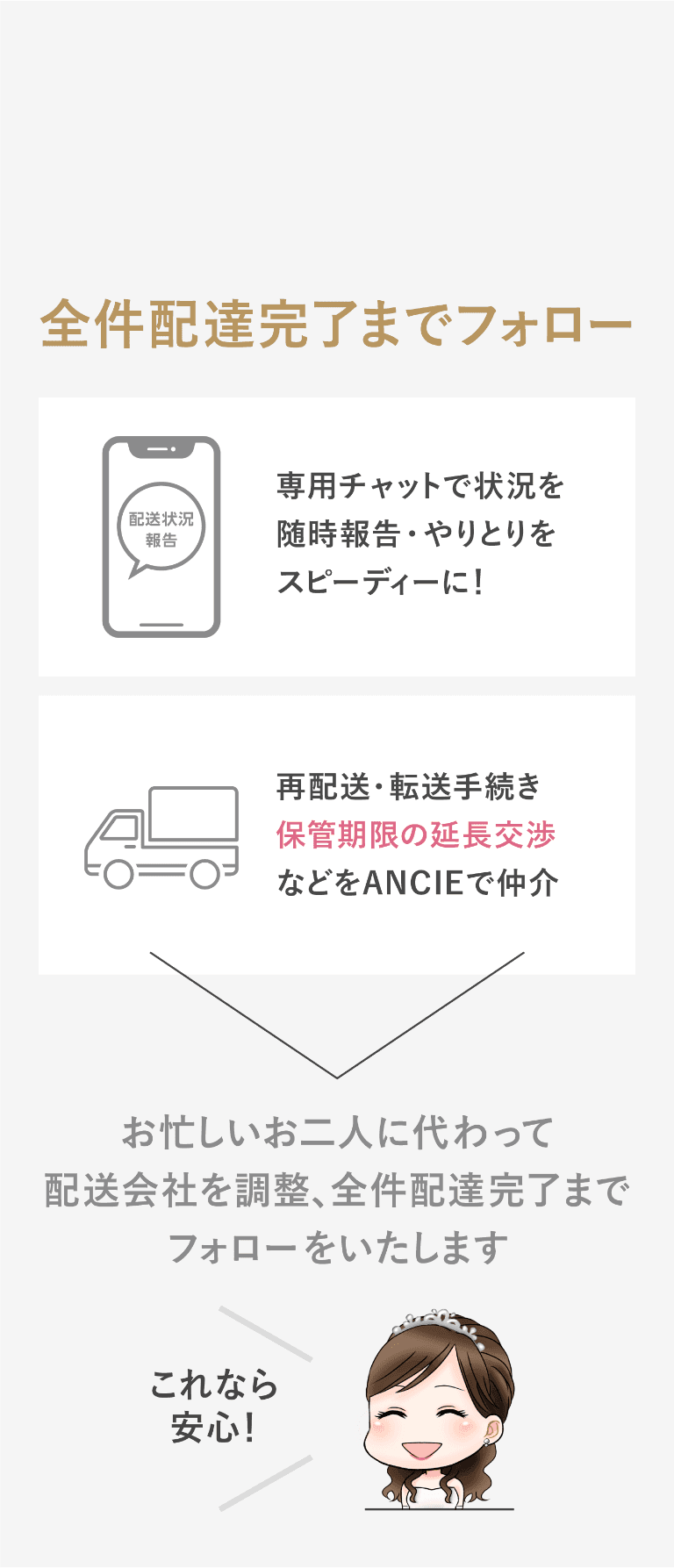• お客様専用チャットで新郎新婦さまと長期間連絡が取れない場合や、配送会社様保管期限が切れてしまった場合は、やむを得ず新郎新婦さまご自宅に転送させていただく場合がございます。この場合は、必ず新郎新婦さまにご一報を入れさせていただきます。