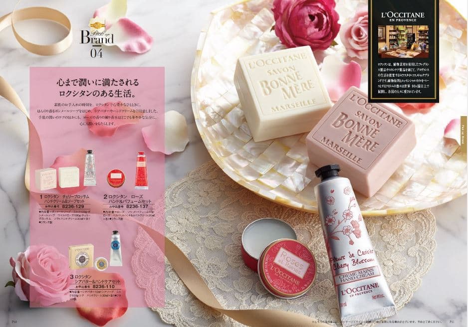 <ジルスチュアート>ペアマグ、<ロクシタン>チェリーブロッサムハンドクリーム&ソープセット<ゴディバ>ゴールドコレクション12粒入り、<ロイヤルコペンハーゲン>ホワイトフルーテッドパスタプレート、<ウェッジウッド>ペアマグ、<ヨックモック>バラエティギフト、<銀座千疋屋>銀座フルーツクーヘン、<マリアージュフレール>紅茶の贈り物、<イルムス>ロゴトートバッグ、<フッチェン>バロネスプレート