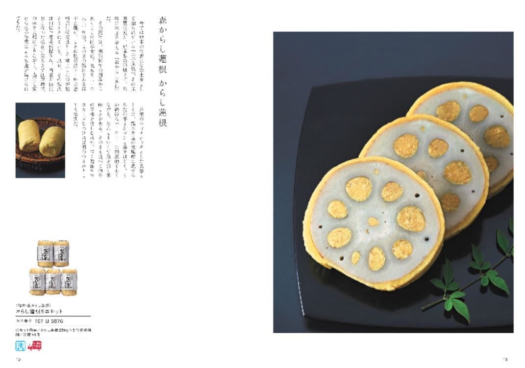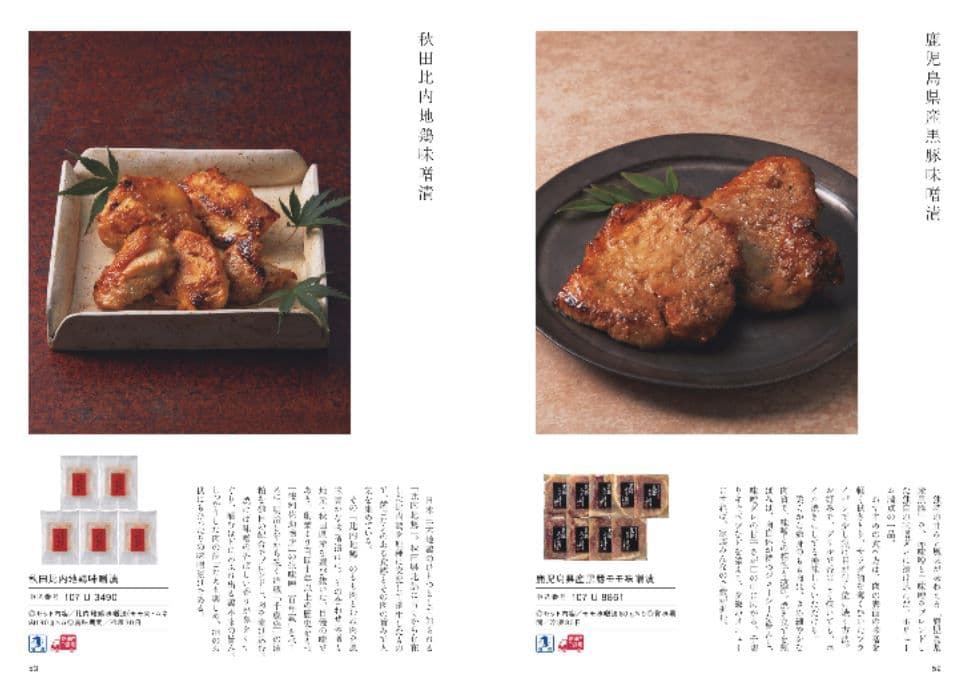 カタログギフトでは、商品掲載数を多くするために1ページに多数の商品を掲載するのが一般的です。一方、日本の美味しい食べ物は掲載商品数を絞り各ページで生産者のこだわりポイントや郷土利用理などを詳しくご紹介したグルメ雑誌のような仕立てになっているのも特徴的です。
