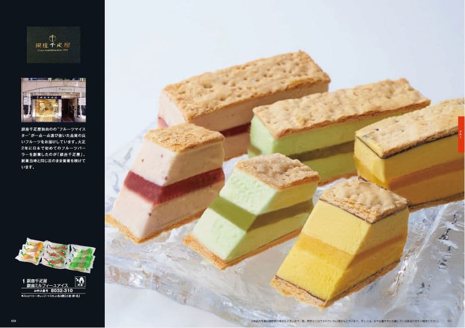 <スクード>紳士腕時計、<銀座千疋屋>銀座ミルフィーユアイス、<ぎおん割烹なか川>ぶどう豆煮と栗の甘露煮、<てつ人陳健一>点心と料理セット、<三代目たいめいけん>カレー・スープセット、<もりもと>太陽いっぱいの真っ赤なゼリー12個