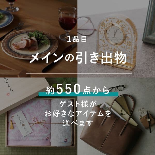 フォションやマイセン、ウェッジウッドなどの高級食器ブランド、スピック&スパンやイエナ、テネリータ、ジョンマスターオーガニックなど上質なブランドのアイテムを掲載。定番アイテムには、引き出物で人気の今治タオルや食器を多数掲載し、上司や親族ゲストが嬉しい大満足の内容でメイン引き出物をご用意しております。