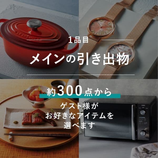 日本伝統の婚礼らしさがある縁起物の鰹節や赤飯・昆布、現代風の縁起物であるスープセットや紅茶・コーヒーセットもご用意。さらに、引き出物を豪華にするタオルやカトラリー、タンブラーなどプラスワンアイテムもお選びいただけます。昔ながらの縁起物に、今欲しいプラスワンアイテムなど、伝統や豪華さを感じる3品目をご用意いたしました。