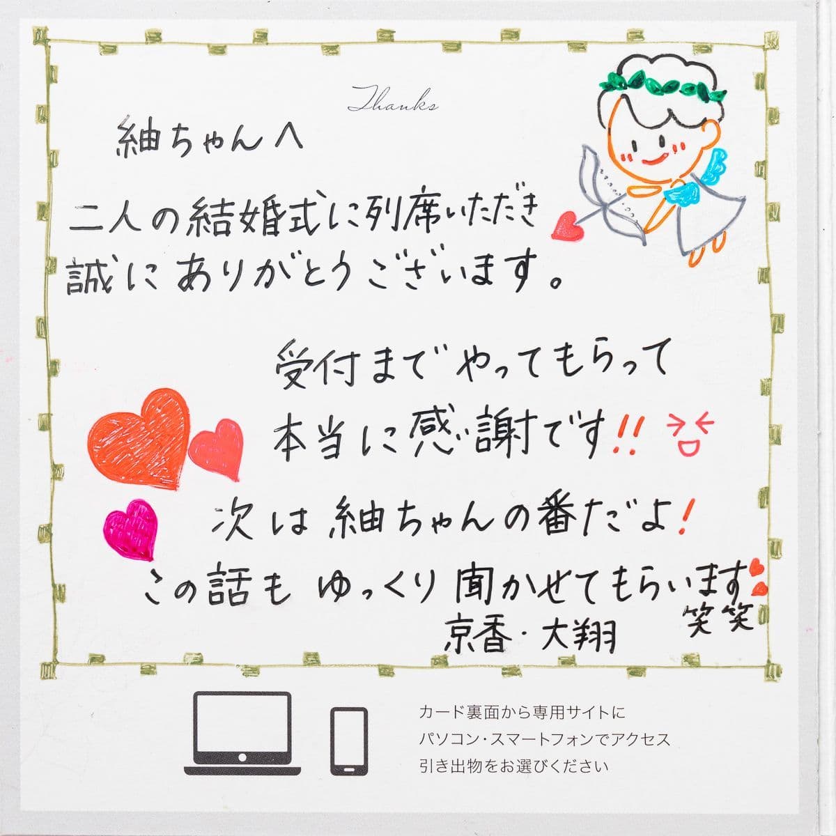 ゲストへの感謝を手書きで伝えられる引き出物カードです。