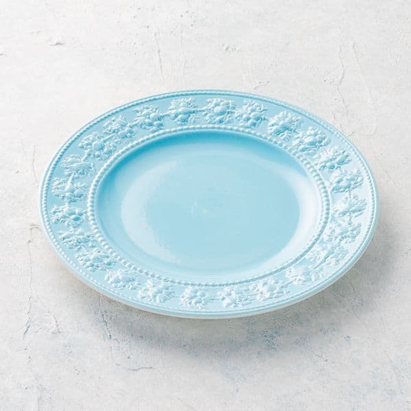 祝祭と豊穣を象徴するフェスティビティシリーズの中でも特に目を引くアイテム。豊かなターコイズブルーの背景に、繊細な白の花綱モチーフが施されたレリーフは、料理をより美しく、豪華に見せるための緻密な工夫が凝らされています。