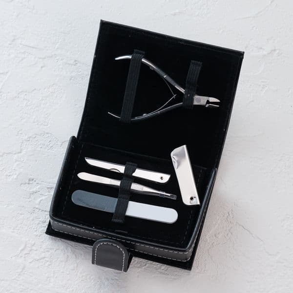 ニッパ型の爪切りや折り込みヤスリなどの身だしなみを整える8つのアイテムをセットにしました。持ち運びに便利な専用ケース付きです。出張の多いビジネスパーソンにオススメの引き出物です。