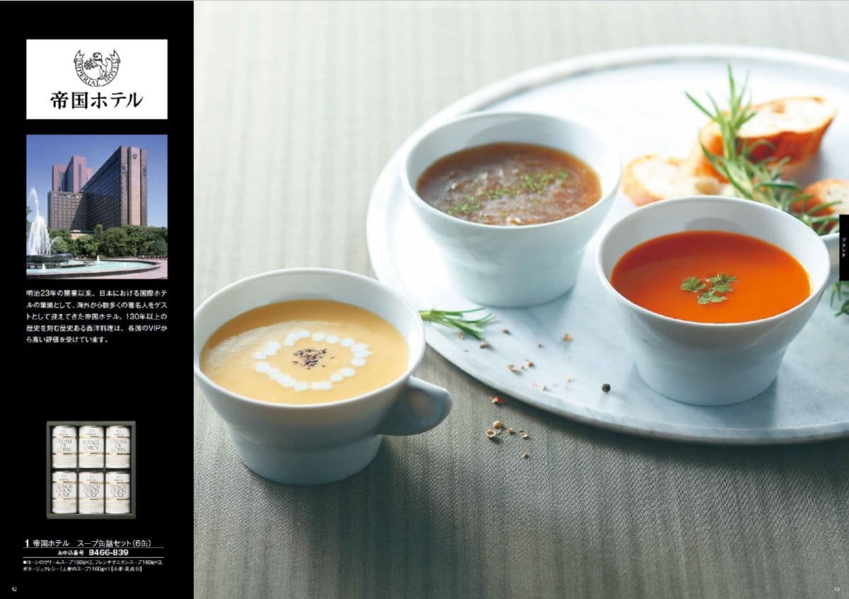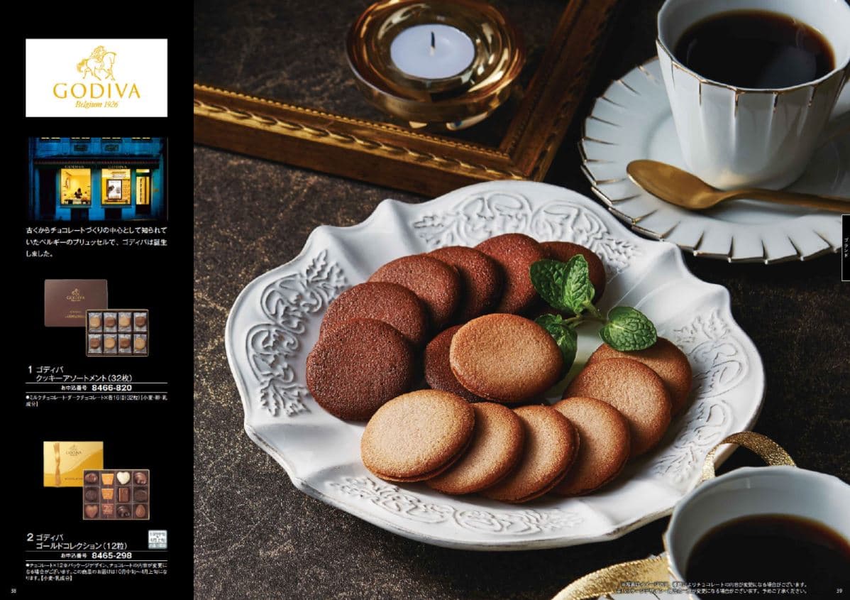 <マルハ>かに缶詰合せ、<北海道産>甘口塩たらこ、<ゴディバ>ゴールドコレクション12枚、<八天堂>プレミアムフローズンくりーむパン10個、<銀座千疋屋>銀座ゼリー9個入り、<ヨックモック>バラエティギフトM、<帝国ホテル>スープセット、<スターバックス>オリガミパーソナルドリップギフト、<祇園はやかわ>ぞうすいセット、<利休>牛タンシチュー、<新潟魚沼産>コシヒカリ(3kg)、<北海道産>ホタテ片貝、<北海道産>天然鮭切身セット、<安田の佃煮>小豆島から