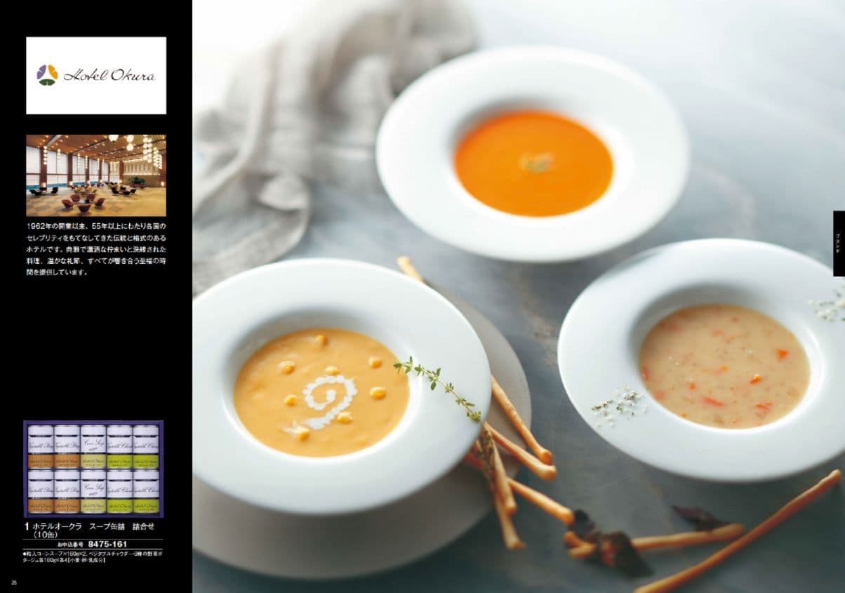 <ミントン>プレステージティーセット、<夢一喜>ハムウインナー詰め合わせ、<デルレイ>ショコラコレクション、<ホテルオークラ>スープ缶詰 詰合せ、<スープストックトーキョー>6スープセット、<ハング>神戸ハングのこだわりハンバーグ、<竹八>だし茶漬けと西京あぶり漬け、<なだ万>おもてなしのすり流しスープ、<貝新>総本家新之助貝新時雨蛤詰合せ、<築地吟海>漬魚詰合せ(計4切れ)<山形牛>赤身焼肉用220g<鹿児島県産>黒豚ももとんかつ、<赤玉本店>牛すじ煮込み、<正田>有機しょうゆ詰合せ