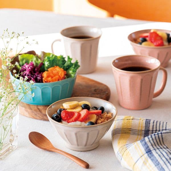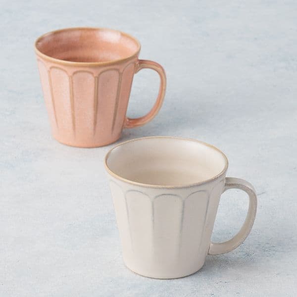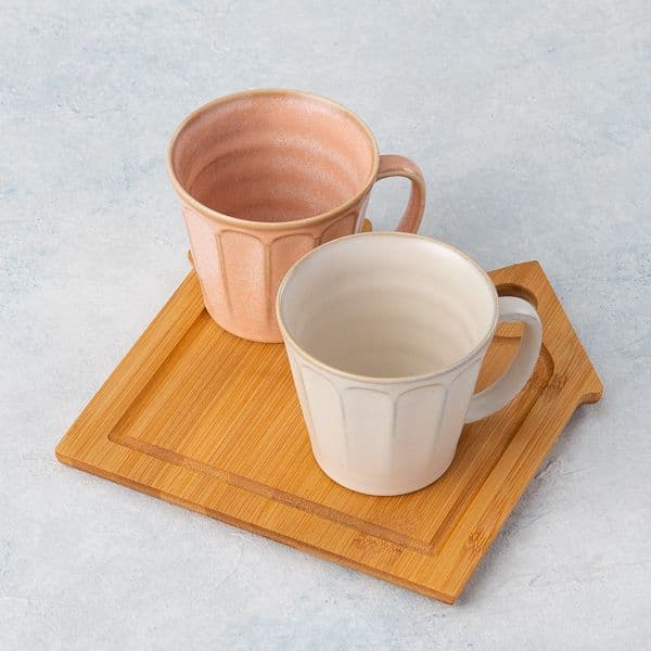 美しい溝彫り加工が施された温かみある色合いが特徴のマグカップセット。マグカップは電子レンジ使用可。毎日の朝食にリラックス感を与えてくれます。