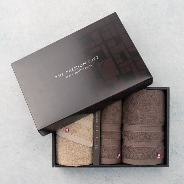 今治プレミアムのフェイスタオル2枚、ゲストタオル1枚のセット。ホテルのタオルのように少し大きめで厚手です。高級感があるので贈答品に喜ばれます。