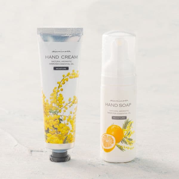 ミモザ精油がふんわりと柔らかく香るコスメセットです。 ハンドクリームは、するすると伸びる滑らかな使い心地。 天然香料の優しい香りに包まれながら、肌をしっとりと保湿します。 ハンドソープはさわやかで心落ち着く香りが特徴。 手洗いの時間が素敵なリフレッシュタイムに変わります。女性の友人や同僚のゲストに選ばれています。