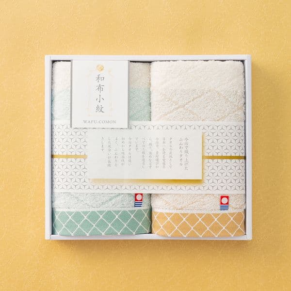 今治製のフェイスタオル2枚セット。小紋柄をあしらったシンプルなデザインでいろんなシーンで活躍します。吸水性、機能性に優れ、ふわふわ感が長持ちします。
