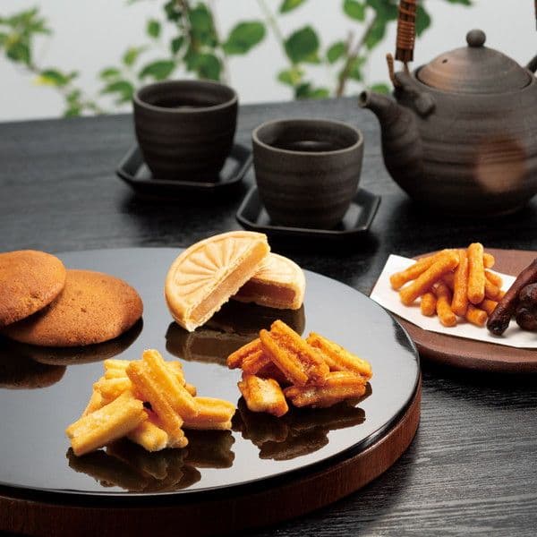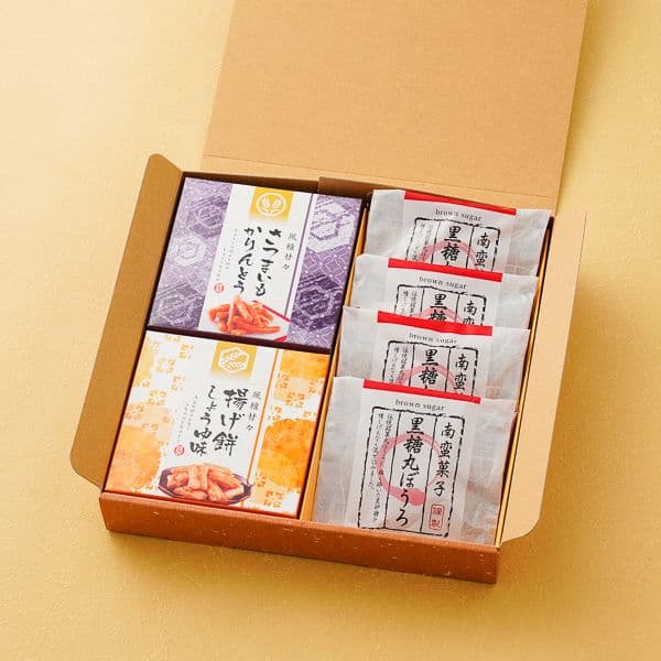 荒く砕いた黒砂糖を練りこんだ黒糖丸ぼうろ、国産玄米から作られた米油100%でからっと揚げたさつまいもかりんとう、国産のもち米を使用し作られた揚げ餅のセットです。ちょっとしたお茶菓子にぴったりです。