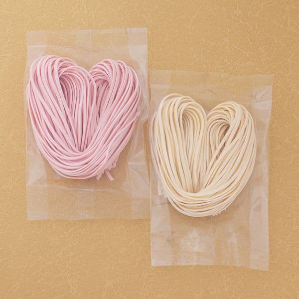 ハートの形をした紅白うどんは、かわいらしい見た目と縁起のよさから、親族から友人まで幅広いゲストにおすすめです。
