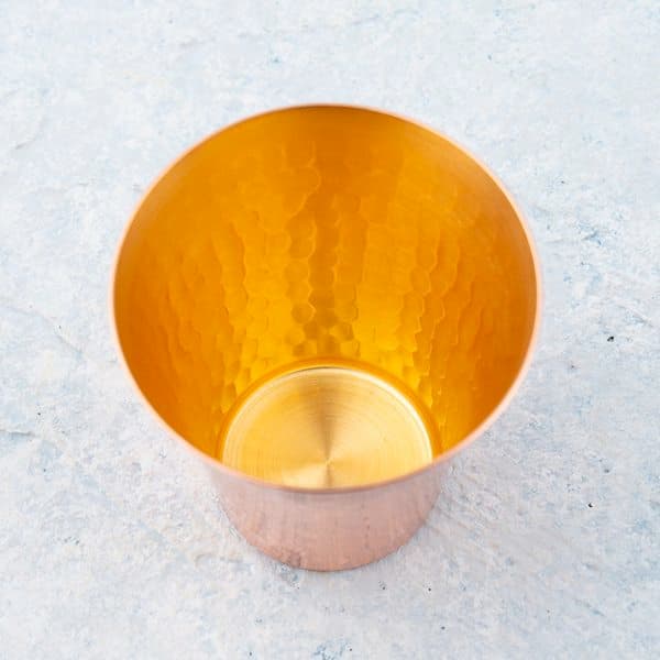 外側は赤銅色の槌目仕上げ、内側には金メッキを施した高級感たっぷりの上質な輝きをまとっています。