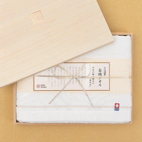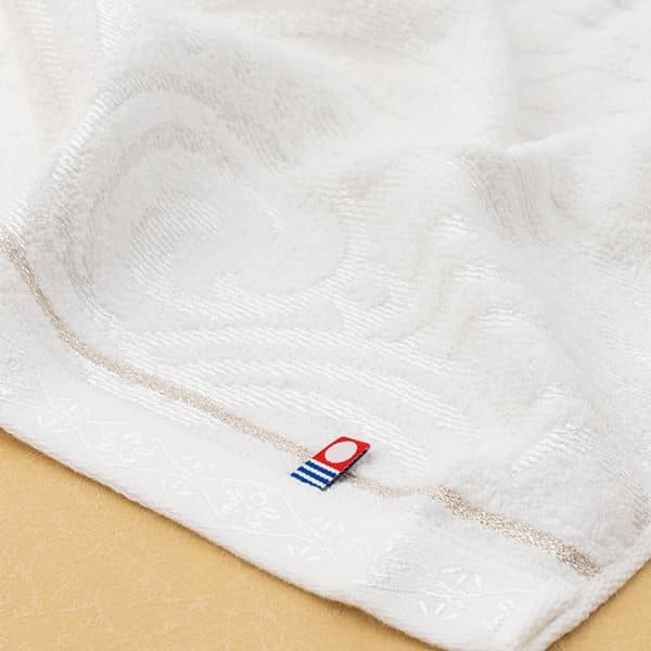 綿本来の吸水性を最大級に引き出す匠の技「今治本晒」。綿本来の“本物”の白さと、それを際立たせる上品な銀糸・光沢糸が華やかさを演出します。