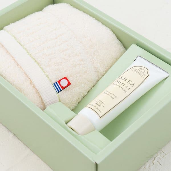 今治のオーガニックタオルとシアバターハンドクリームをセットにしました。ふわふわのタオルと、しっとりもちもちになるハンドクリームはもらって嬉しいこと間違いなしです。