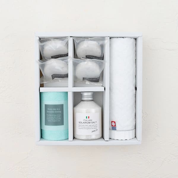 ソルト(イタリアン)(180g)×1・ソルト・フィズ(40g)×4・今治ウォッシュタオル30×28cm×1(綿100%)・マイクロファイバークロス25×25cm×1(ポリエステル80%・ナイロン20%)
