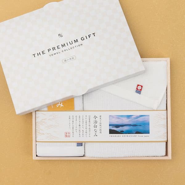 清らかな白波のように美しい純白の今治製のフェイス・ハンドタオルセットです。凹凸感ある独特の風合いで上質な仕上がりです。木箱入りで贈り物にぴったりです。