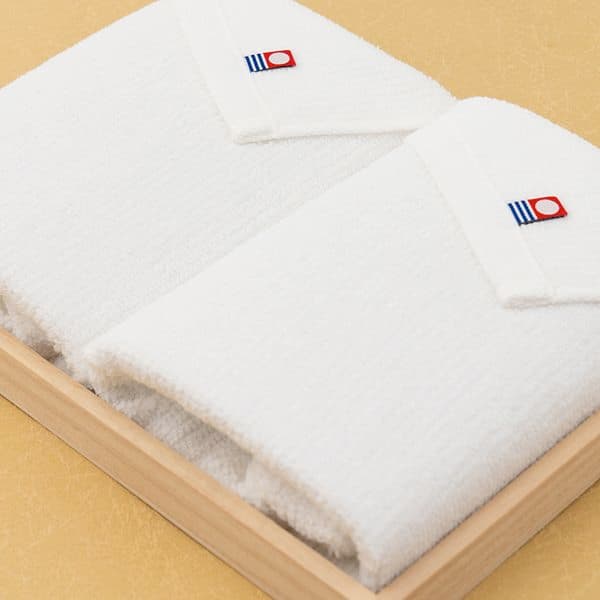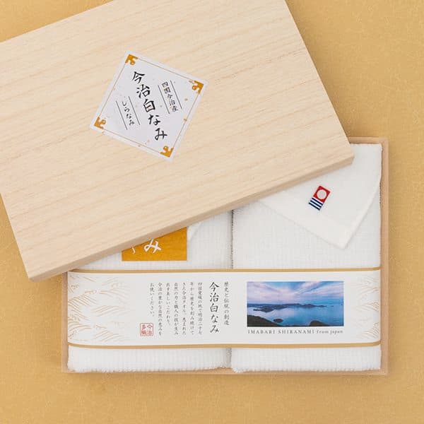清らかな白波のように美しい純白の今治製のフェイスタオルセットです。凹凸感ある独特の風合いで上質な仕上がりです。木箱入りで贈り物にぴったりです。