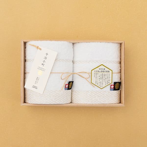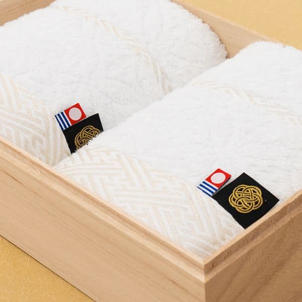 エレガントで高級感があり、優れた吸水性を誇るメイドインジャパンのクオリティ。白無垢をイメージした清らかなデザインと、木箱入りのため高級感のある引き出物です。