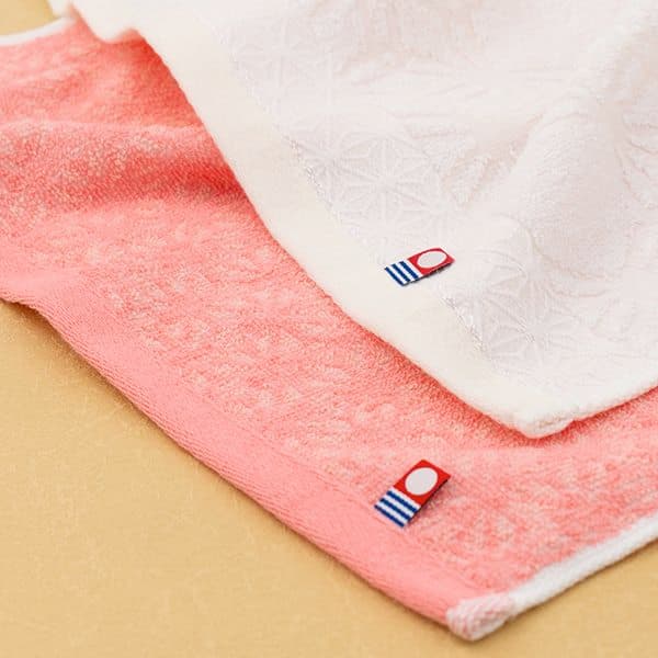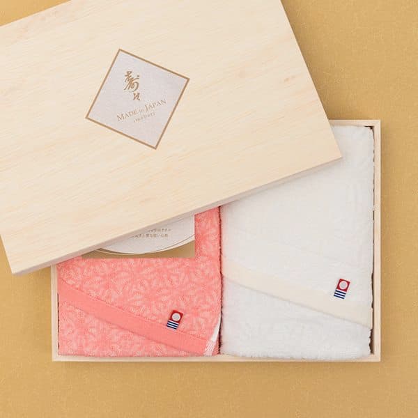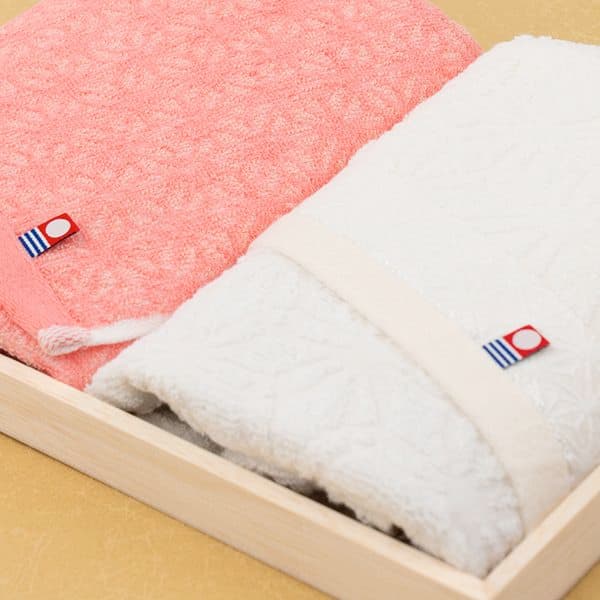 今治認定商品。タオルの柄の麻の葉模様は伝統的な和柄の一種。麻は古くから「健やかな成長を願う」縁起のいい柄とされています。高級木箱入りでお祝い事や晴れの日の贈り物にぴったりです。フェイスタオル2枚セット。