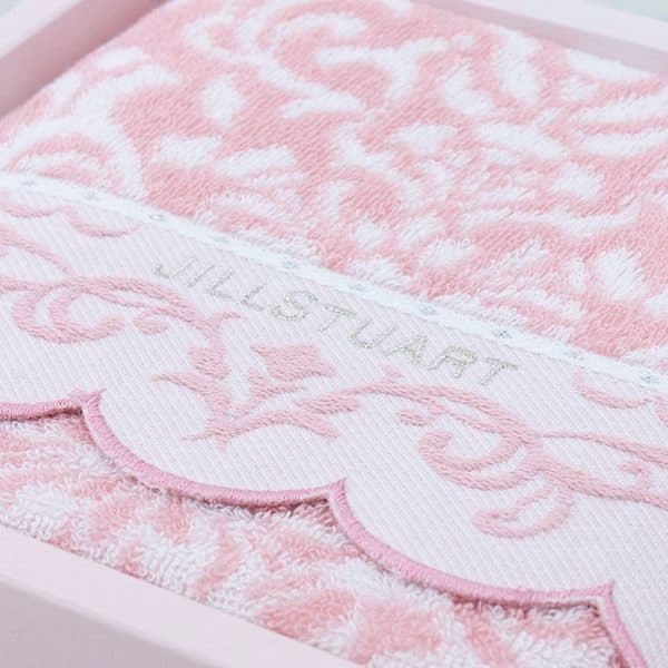 ふんわりとしたピンクに映える、ブーケのように美しいダマスク柄とスカラ刺繍が魅力的。タオルの端の優雅なカットデザインが、フェミニンで洗練された印象を演出します。