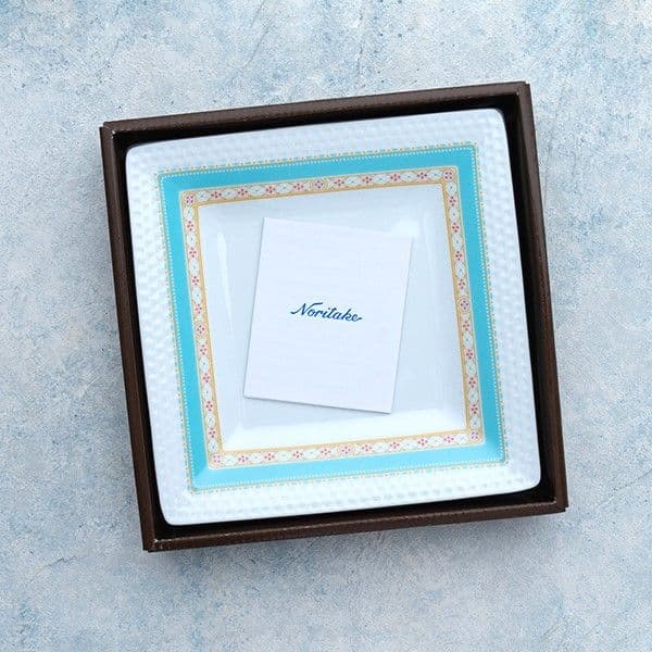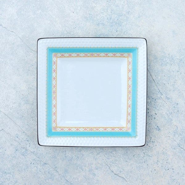 柔らかな青と白のコントラストと、プレートの縁に描かれたゴールドが高級感を演出。スクエア型で使い勝手のよさも◎