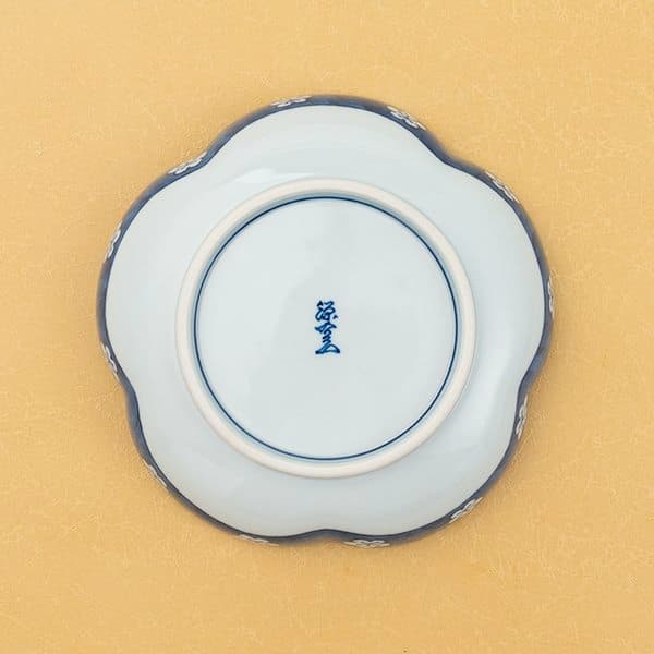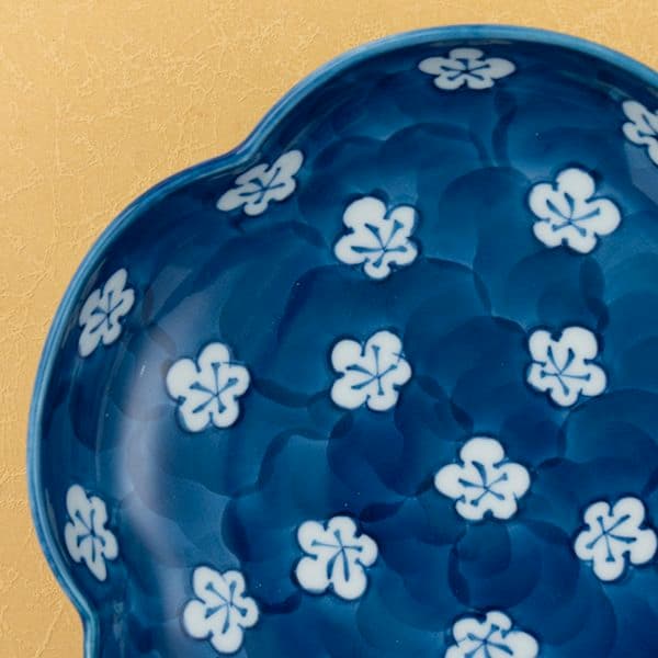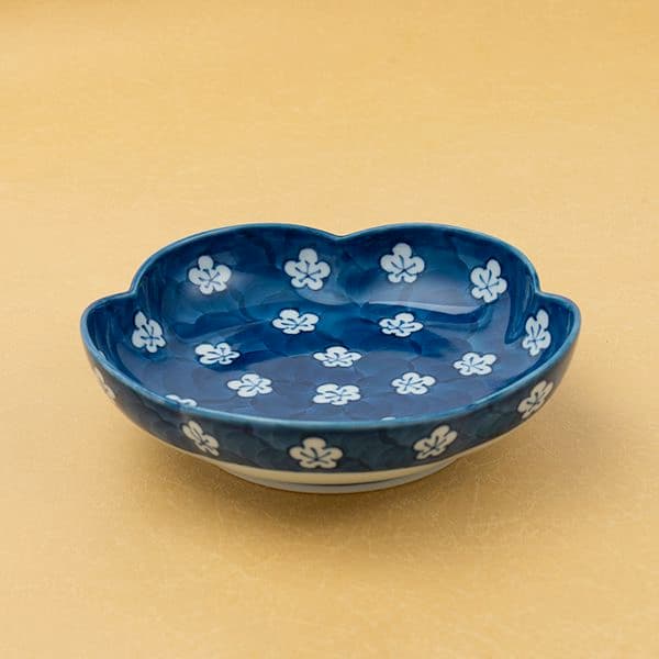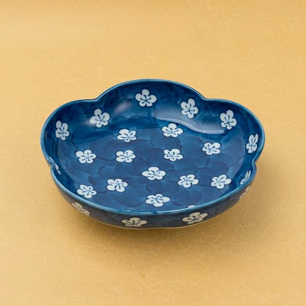 古染風梅紋(梅型)鉢は、愛らしい梅花の形が食卓に華やかなアクセントを添えます。