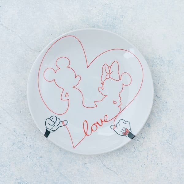 ミッキーとミニーが描くハートモチーフに、"赤い糸"を思わせる繊細なラインアートを織り交ぜたロマンティックなデザインになっています。