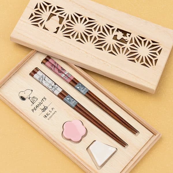 昔からお箸は「幸せを橋渡し」するとされ、引き出物や結婚内祝いの人気ギフトのひとつ。天然木の優しい風合いのお箸には、可愛らしいさスヌーピーとウッドストックが描かれています。