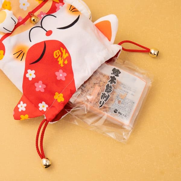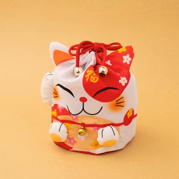 縁起のいい招き猫のかたちをした巾着に入っています。可愛い小物入れとして使っていただけます。