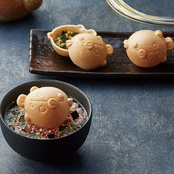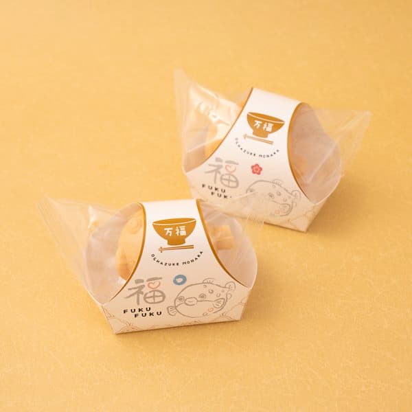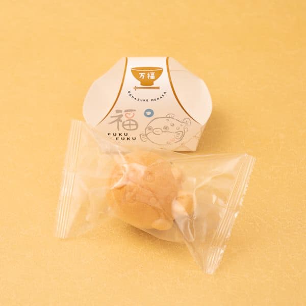 福に通じる縁起のいい魚と言われている”ふぐ”。ふぐ最中の中には海苔と梅の2種類のお茶漬けが入っています。温かいご飯の上にのせてお湯を注げばふぐが浮かぶかわいいお茶漬けの完成です!