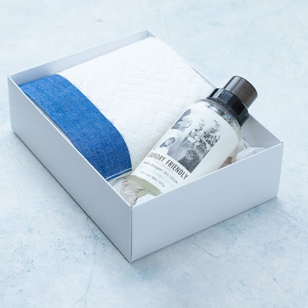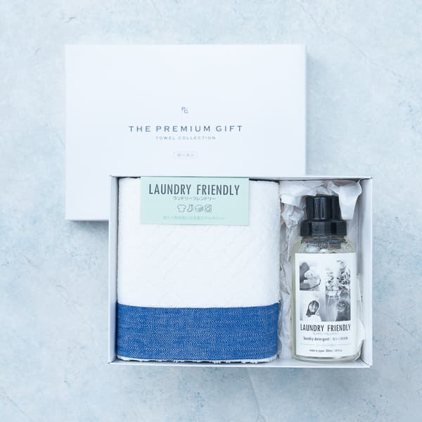 ネイビーの差し色が美しい日本製フェイスタオルと、ユーカリの香りが爽やかに広がるボトルタイプの洗たく用洗剤のセットです。