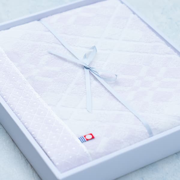 甘撚り製法で仕上げた柔らかさと軽やかさ、今治製ならではの吸水性は、長く愛用いただけるはず。ヘム柄で上品さもあり、華やかな結婚式にぴったりの記念品です。