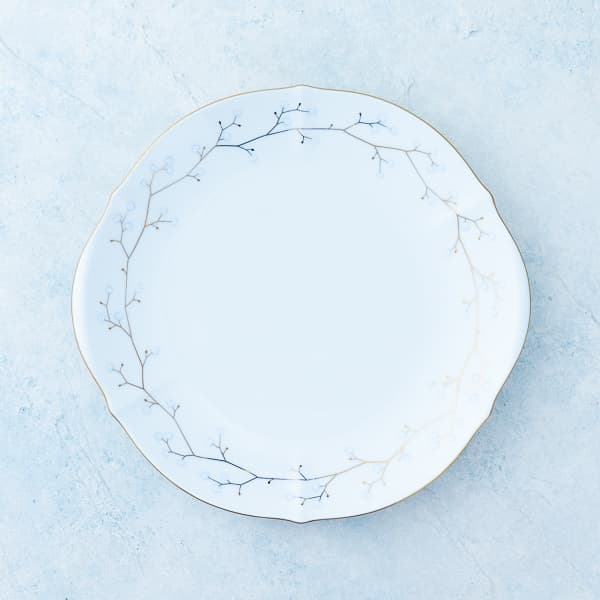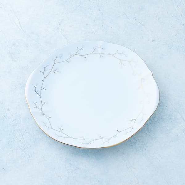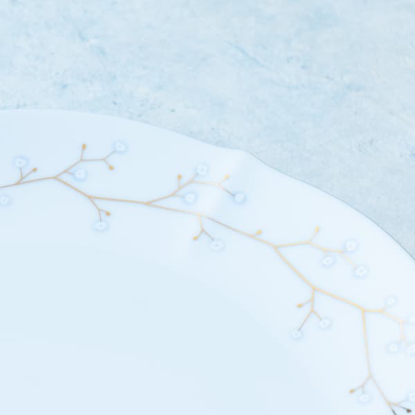 かすみ草の花冠をモチーフにした繊細なデザインと、控えめな金彩のゴールドラインが上品なアクセント。シンプルながら華やかな雰囲気を演出します。