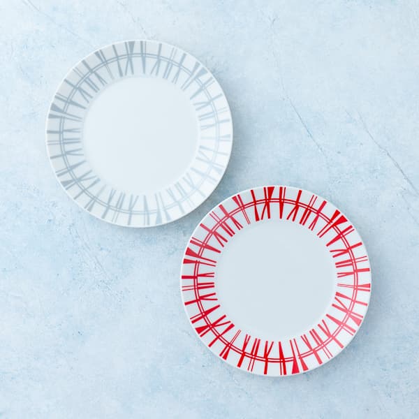 赤とグレーのコントラストが印象的なマグ・プレート・ボウルの組み合わせは、日常使いにぴったり。ご夫婦ゲストへの引き出物としても、センスが光る記念品です。