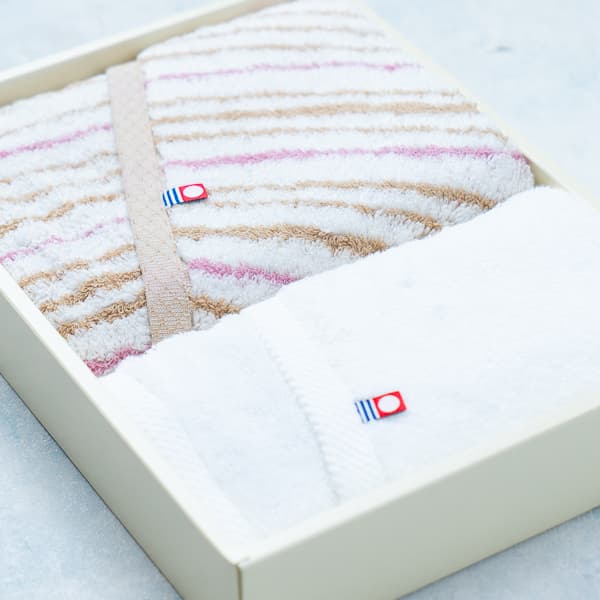 無地の白タオルは清潔感と上品さを、ストライプ柄はやわらかな華やかさを演出。友人や同僚への引き出物としておすすめです。