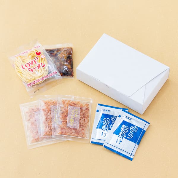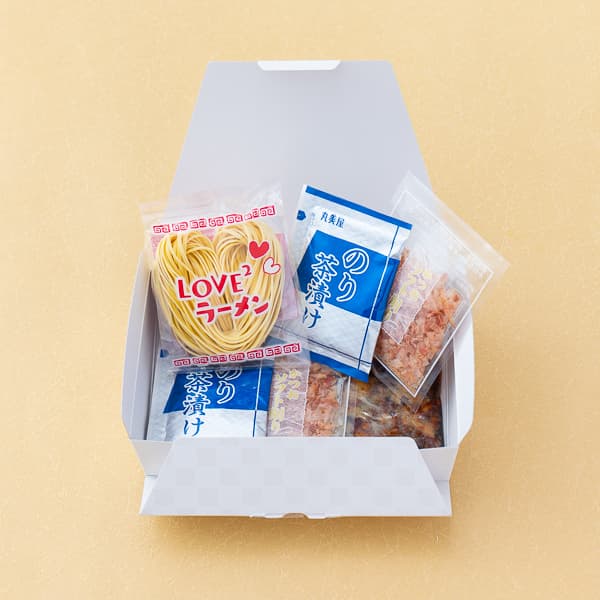 ハート型の可愛いラーメンと、鰹節香るお茶漬けを詰め合わせた、遊び心ある三品目です。