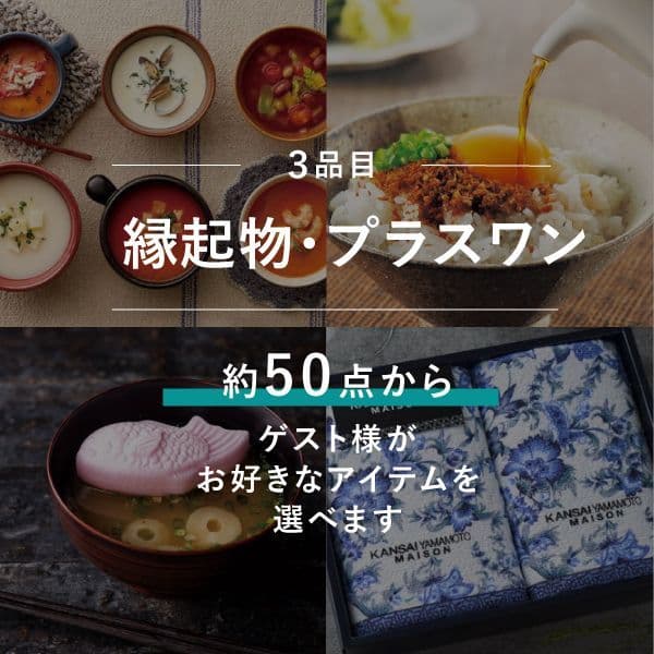 かつお節や赤飯、梅干し、うどんの他に調味料やスープ、ラーメンなど幅広いグルメアイテムを掲載。さらに、タオルやコーヒー、カトラリーなども。引き出物の豪華さが伝わる三品目になっております。
