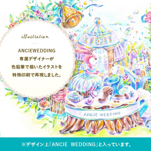 色鉛筆で描いたイラストを特殊印刷で再現し、まるで絵本の中のような幻想的な印象に。ゲストの目を引く引き出物カードは、開いた瞬間から心がときめく特別な一枚です。