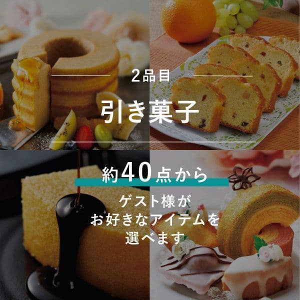 引き菓子の定番として人気のバウムクーヘンをはじめ、クッキーやデニッシュ、ケーキ、アソートなど。またレストランのシェフが監修したスイーツ、甘いお菓子が苦手なゲストさまはおつまみからも選べます。