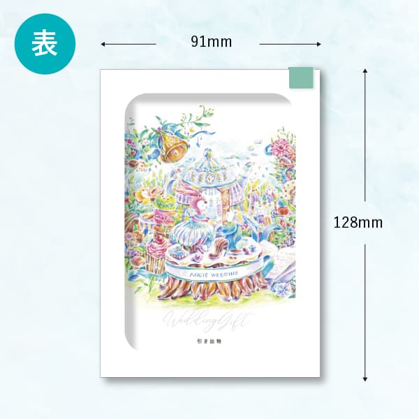 色鉛筆で描いたイラストを特殊印刷で再現し、まるで絵本の中のような幻想的な印象に。ゲストの目を引く引き出物カードは、開いた瞬間から心がときめく特別な一枚です。