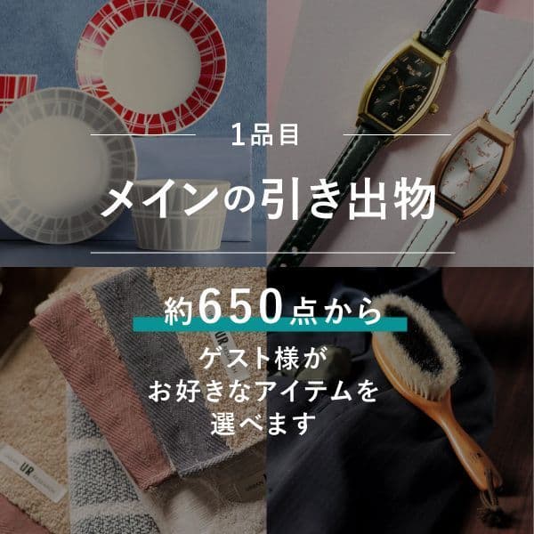 かつお節や赤飯、梅干し、うどんの他に調味料やスープ、ラーメンなど幅広いグルメアイテムを掲載。さらに、タオルやコーヒー、カトラリーなども。引き出物の豪華さが伝わる三品目になっております。