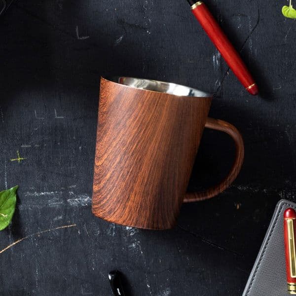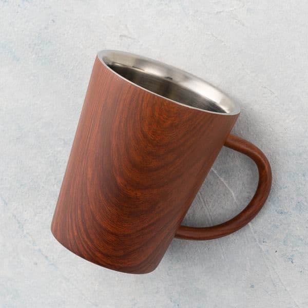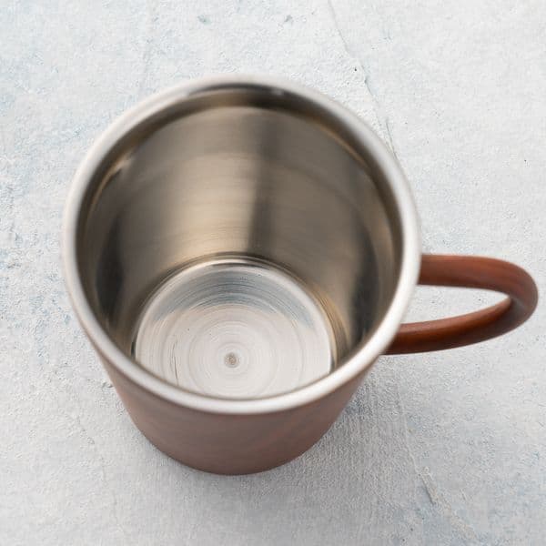 外側は木目調デザイン、内側は、鏡面仕上げをしたステンレス素材になっており、金属と木目のコントラストが落ち着いた雰囲気を出します。