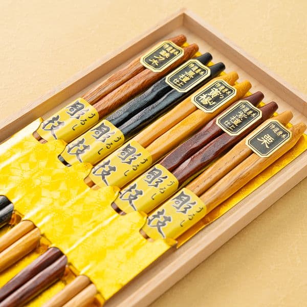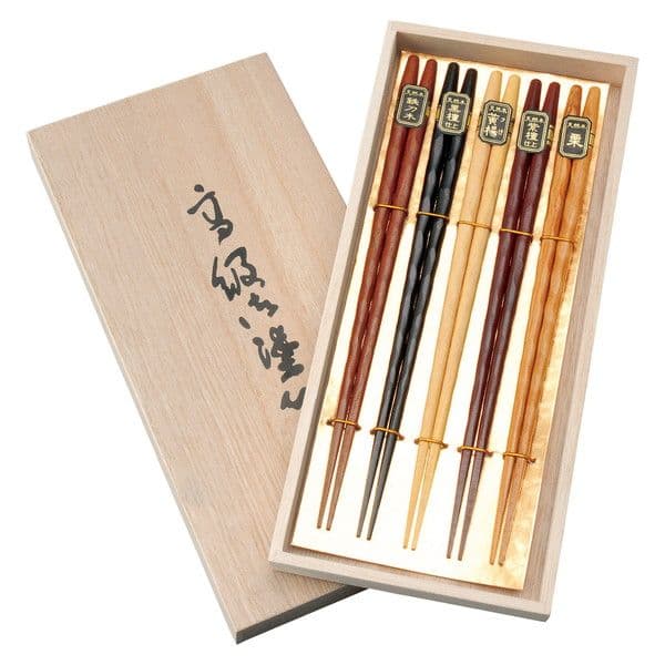 幸せの橋渡しとして縁起のいいお箸の5膳セットです。天然木を握りやすい形状に加工しており、普段使いはもちろん来客用でも活躍してくれます。高級感のある桐箱入りです。