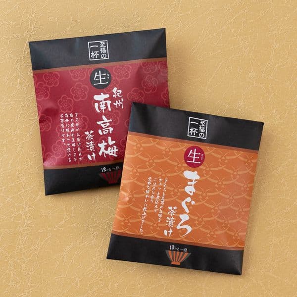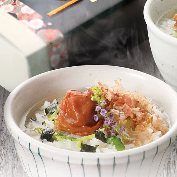 具がたっぷり入った御馳走お茶漬け。具材は、紀州南高梅とマグロ佃煮の二種類。和風出汁と焼津産かつお節で、本格的なお茶漬け屋さんのような美味しさです。感謝のメッセージを書いたギフトボックスでお届けいたします。